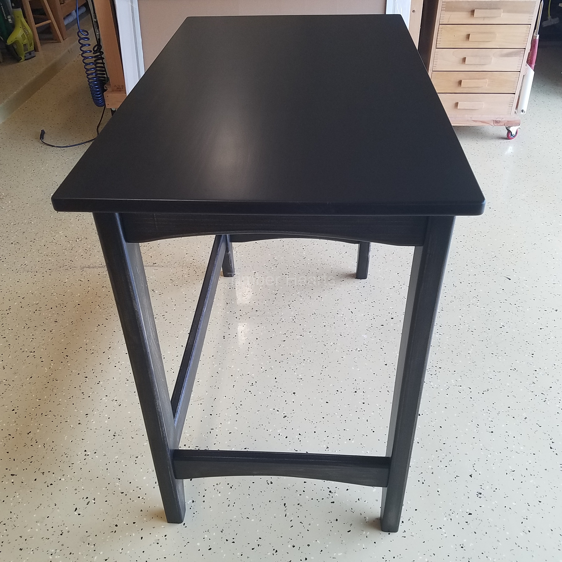 This standing desk/craft station was created with poplar. The entire piece was then stained with a black stain and the base was distressed.